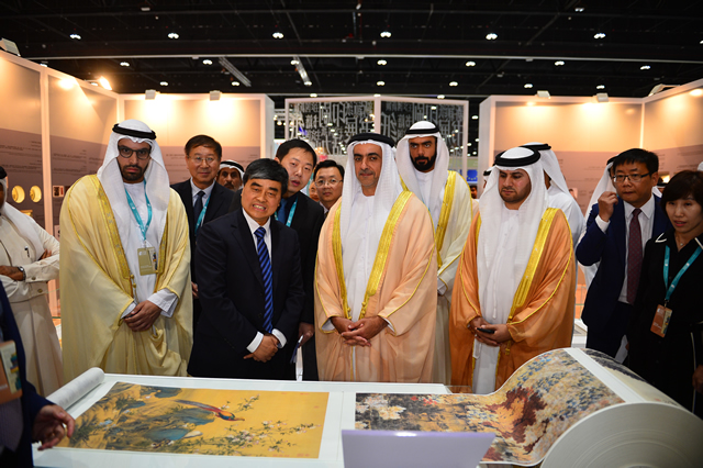 2017年4月,在第二十七届阿联酋阿布扎比国际书展上,中图数科作为参展单位在中图公司的带领下参加了中国主宾国活动。活动中,时任国家新闻出版广电总局副局长吴尚之将我们出品的古书画印刷品《千里江山图》长卷作为国礼赠送给莅临展台参观的阿联酋副总理兼内政部长赛义夫·本·扎耶德·阿勒纳哈扬亲王。